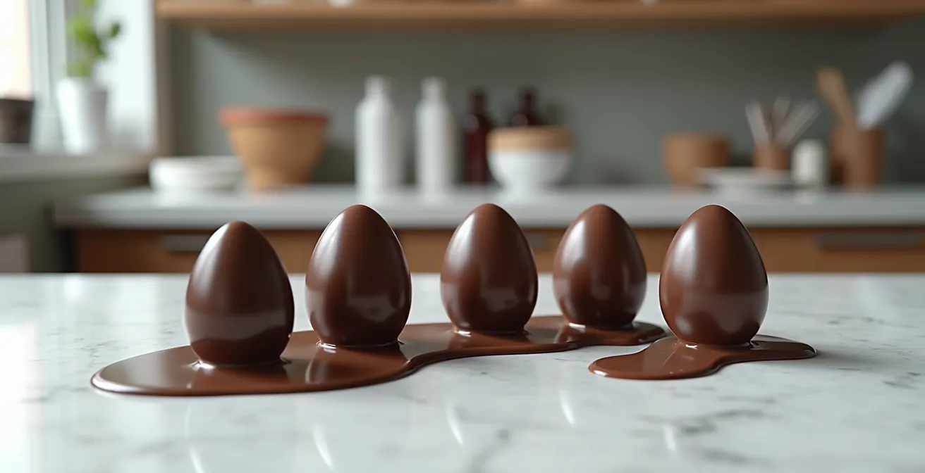 Another silent saboteur is condensation. When a cold egg is brought into a warmer, more humid room, microscopic water droplets form on its surface. This moisture can dissolve sugar in the chocolate, which then recrystallizes on the surface as a dull, white film known as sugar bloom, ruining your hard-earned shine. Professional chocolatiers have a simple but effective technique to prevent this. They allow the set eggs to acclimatize to room temperature for 20-30 minutes while still in their molds before handling. This gradual transition prevents the abrupt temperature change that causes condensation, preserving the flawless, glossy finish you worked so hard to achieve.