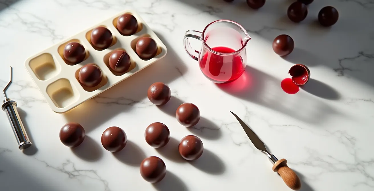 The ultimate challenge for any advanced confectioner is the creation of a bonbon that offers a dramatic textural contrast: a liquid fruit coulis that bursts forth from a paper-thin, crisp chocolate shell. Many attempt this, but the results are often disappointing—leaks, a soft shell, or worse, premature mold growth. The common advice often revolves around generic tips like using a thick shell or simply “being careful” during sealing. These approaches miss the fundamental point and often sacrifice the very delicacy we aim to achieve.