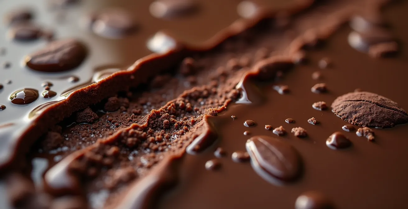 This emulsion is incredibly fragile. As documented by King Arthur Baking, excessive heat is a primary culprit for breaking it. When a ganache is heated too high (e.g., above 180°F), the delicate bonds holding the sugar, cocoa solids, and fat together are shattered. The fats then cluster together, squeezing out the water and resulting in a greasy separation. This is why pouring boiling cream directly onto chocolate without allowing it to cool slightly is a common cause of failure. The emulsion was never given a chance to form correctly. In fact, cutting-edge research in Nature Communications shows that even a tiny 0.1% addition of phospholipids can be critical for stabilizing the very crystal structure of chocolate.